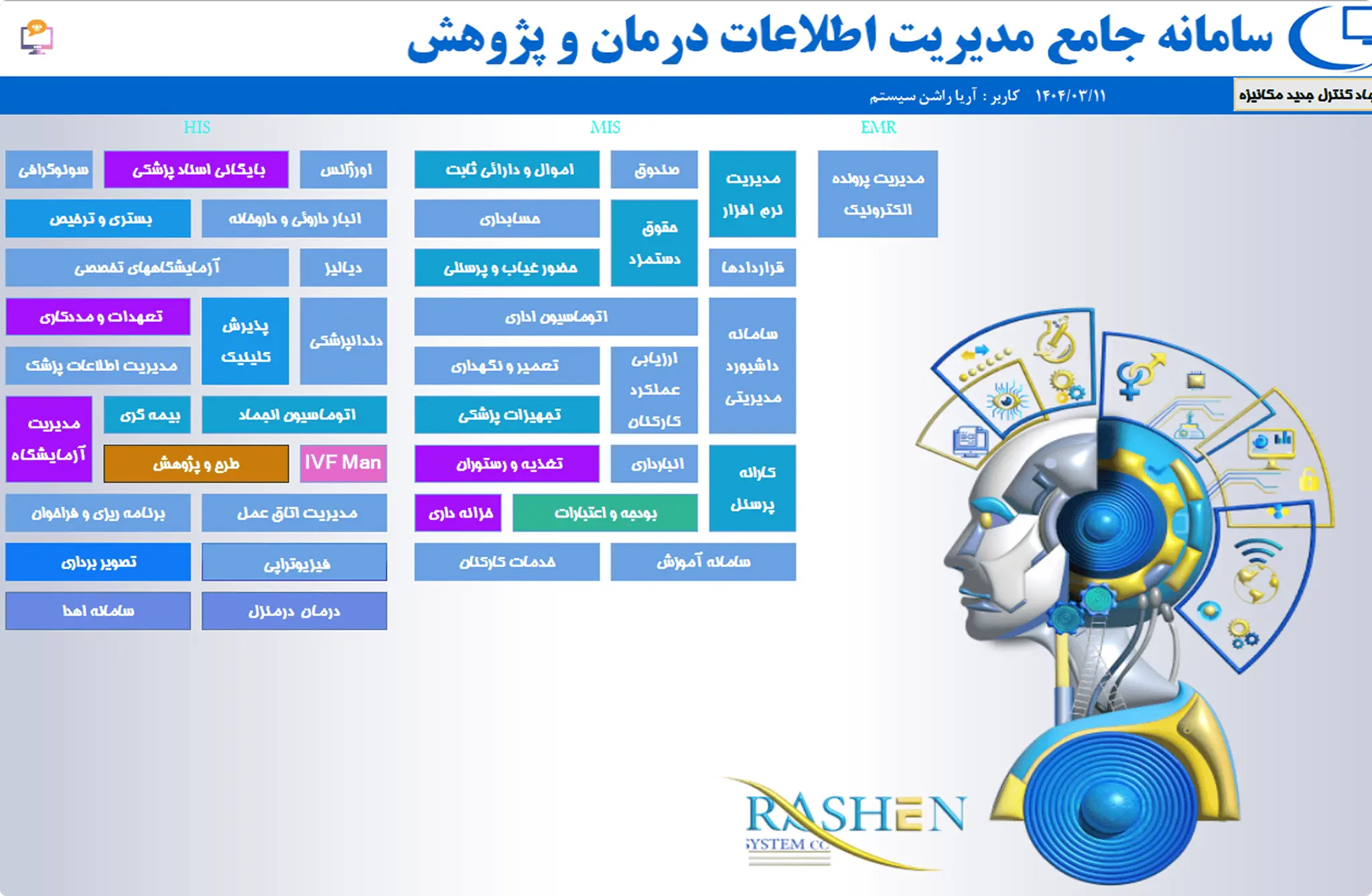 راشن سیستم آریا همواره تلاش داشته تا با تحلیل دقیق نیازهای مراکز درمانی، نرمافزارهایی منطبق با استانداردهای روز دنیا و متناسب با شرایط بومی کشور ارائه دهد. تولید و پیادهسازی موفق سیستم اطلاعات ناباروری در مراکز معتبری همچون پژوهشگاه رویان و ابنسینا، تنها بخشی از رزومه موفق این شرکت در اجرای پروژههای تخصصی و حساس درمانی میباشد.